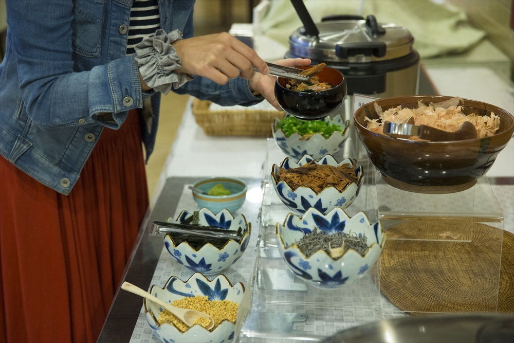 昨年より朝食をリニューアルし、指宿産の本枯節を使ったかつおのだし茶漬けをご提供しております♪